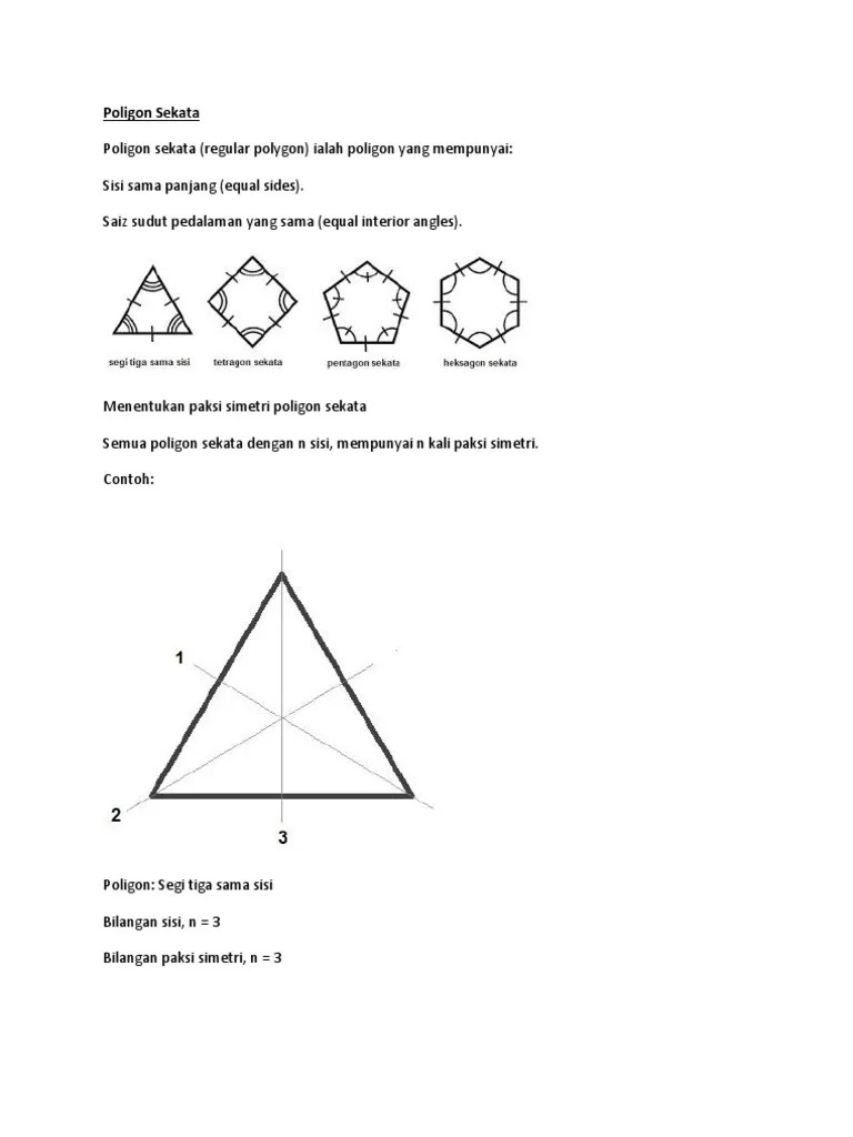 Poligon Sekata Paksi Simetri Heptagon - Poligon. Terdapat dua jenis poligon, iaitupoligon sekatadanpoligon tidak sekata. 6 rajah menunjukkan bahagian poligon sekata dengan mn sebagai paksi simetri. Apakah nama bagi poligon ini? Penjuru, paksi simetri, sudut dan pepenjuru. Bilangan paksi simetri heptagon ialah 7. Gambar rajah berikut menunujukkan sebuah poligon sekata.